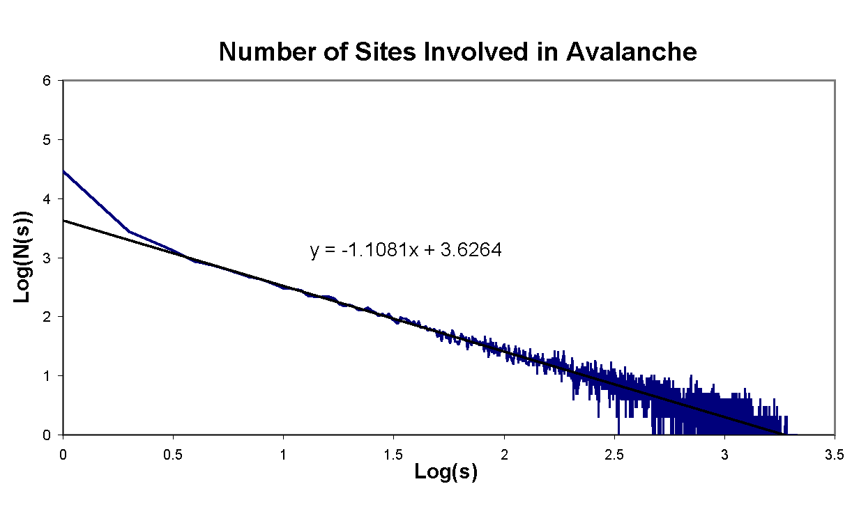 Self-Organized Criticality within SandpilesLarsson OmbergIntroductionImagine being able to describe earthquakes, land formations, starquakes, stock market dynamics, evolution and brain signals with one theory. It sounds very far fetched but it seems that these phenomenon have similarities that might lend them to be studied with a unified theory. A dominant common denominator between these phenomenon is that they all exhibit some sort of power law dynamics. For earthquakes the law is known as the Gutenberg-Richter law and has been known for quite a long time. In experimental science the phenomenon is known as "1/f-noise." It was this phenomenon that lead Chao Tang, Kurt Wiesenfeld and Per Bak to formulate the theory of Self-Organized Criticality (SOC) in 1986. A theory proclaiming that these systems evolve into an critical state by them selves a state that gives power laws. Together with their presentation they have developed a very simple model that exhibits SOC Sandpile ModelThe model created can be likened to a pile of sand on which one drops sand grains at a very slow rate. As the grains land they either stay where they landed or role downhill. If they roll downhill they will likely disturb other grains which in turn might disturb other grains. This avalanche of toppling sand grains can be of varying sizes take varrying amount of time. The size of the avalanches just as the sizes of earthquakes follows a power law spectrum. What this means that the number of avalanches N of size s is related by: N(s)=s-t Bak has specified the dynamics of the model to a simple algorithm. A grid represents the sand pile where each position i and j has an amount of sand z(i, j).
