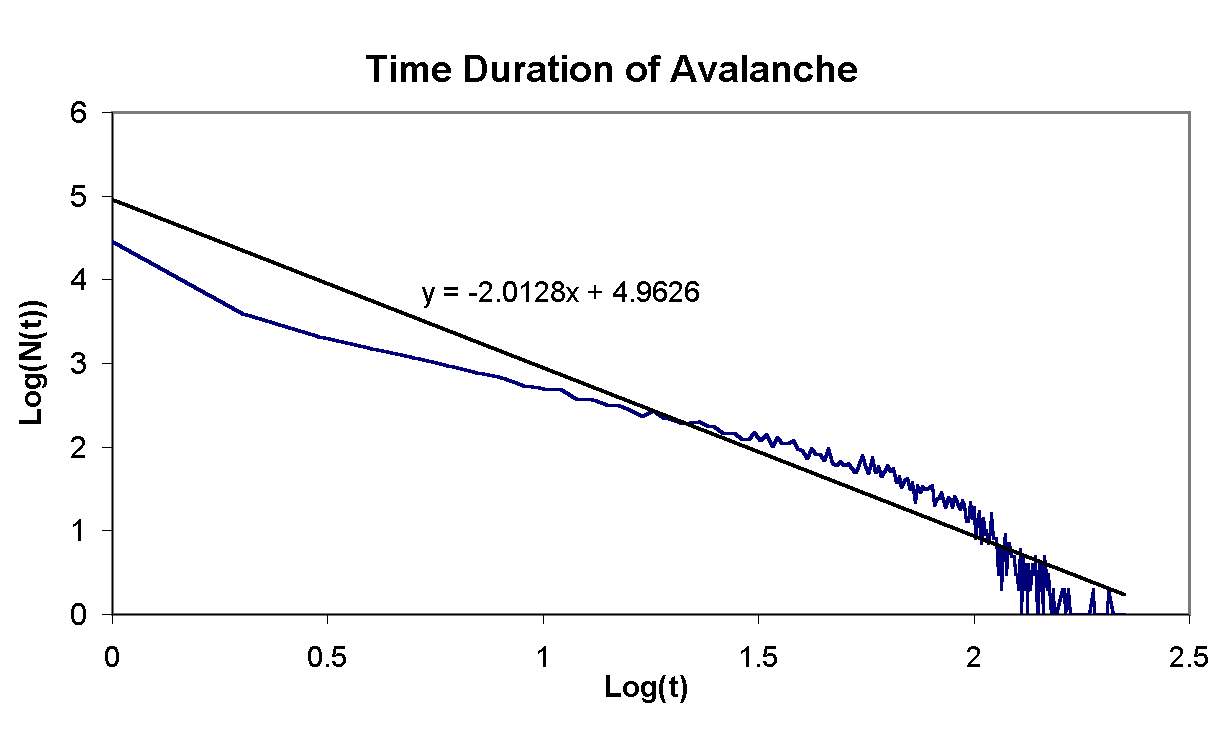 ExperimentThe algorithm was implemented in Java in the form of an applet (see right side). The number of grains at each position is color coded such that darker colors have a lesser value. Before a new grain is dropped the grid is redrawn with red lines surrounding the sites that have been involved in an avalanche. (Please note that the faster your computer the less likely you are to see these red lines.) Whenever the update is halted by pressing the start/stop button the N(s) and N(t) is written to standard out. For the analysis of the dynamics of the pile a grid sized 50x50 was used. The simulation was allowed to run for 50002 dropped sand grains. For each grain dropped the number of sites involved in the avalanche was recorded along with the number of time steps it took for the pile to resettle. AnalysisBy taking the Logarithm of the power law one gets Log(N(s)) = -t Log(s) a linear relation in a logarithmic plot. If the dynamics of the sand pile follows a power law a logarithmic plot of N(s) and N(t) should yield a straight line from which one can obtain t. The plots of the run are displayed bellow. In each plot the black line is a least square fit to the data of which the equation is displayed. From this one can conclude that t for the number sights is 1.1081 and that for the time is 2.012. ReferencesBak, Per. How Nature Works, the Science of Self-Organized Criticality. New York: Springer-Verlag, 1996. Schroeder, Manfred. Fractals, Chaos, Power Laws, Minutes from an Infinite Paradise. New York: W. H. Freeman and Company, 1991. |