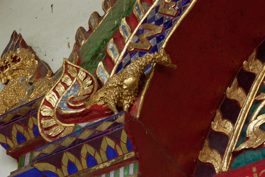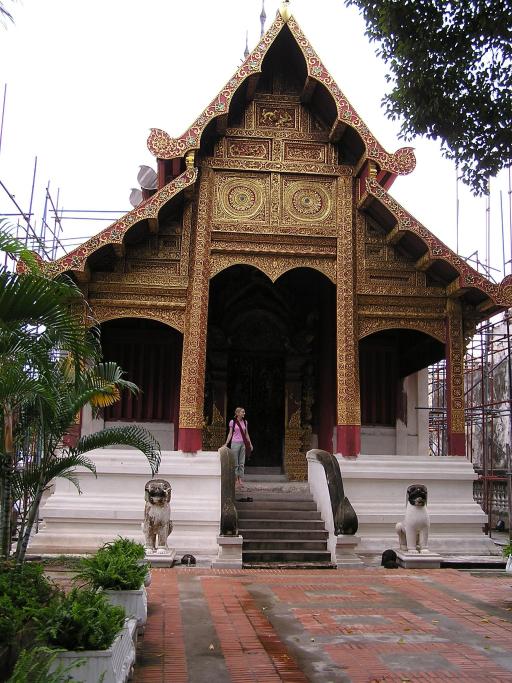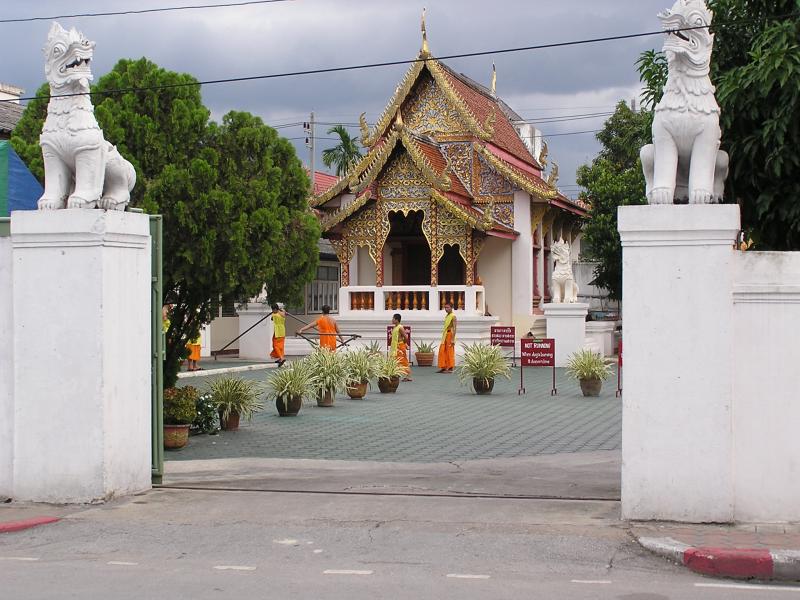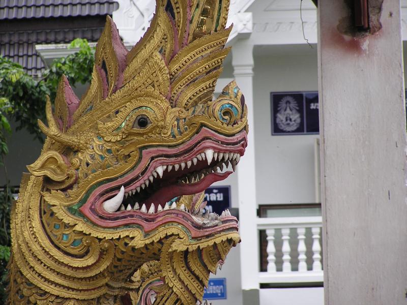 small wai, I mean a big regular Wai. A quick glance reveals the similarities however. The Thai talk in Finnish and Swedish cell phones; drive Japanese, French and German cars; eat at American fast food places; and buy their snacks at American 7-11. And when in the big cities the wealth seems abundant. Before coming here I had read that the average monthly income in Thailand is 5000 Baht or a little less than $125. The urban Thailand I see have none of the signs of being poor. The cars are nice the people well dressed and the similarities to a western metropol striking. Revelations to the differences started on the way up to Chiang Mai, the first stop on this trip together with Micheleen. Already at the bus station in Bangkok I was introduced to legendary Thai friendliness. Having reached the terminal straight from the airport, it looked more like an angry anthill inscribed with hieroglyphics than a bus station. But before the confusion could sink in a Thai who knew little more than a sentence of English asked "Where are going." Which led to a whole hand holding affair that ended up with Micheleen and I on the right bus to Chiang Mai. It is not uncommon to get very much help and always with a big smile. I have yet to feel like an unwanted outsider even though I stick out like a sore thumb at times. Knowing very little about Buddhism I am inclined to attribute this very friendly behavior to their Buddhist beliefs. Besides the friendliness and the smiles the Buddhist temples and prayer is very present in society. The obvious presence might be exasperated by the colors and decorations of the temples. There might be as as many churches in Europe or more likely the States but the in-your-face-appearance of the Buddhist Temples makes them impossible to miss. (Please look at the pictures for an explanation to what I mean.) Many remind me of the Golden Hall of Rohan or a chinesse new years celebration. After a week of observing Thailand I could summarize my impressions by borrowing a sentence from a Thai climber I meet in met here in Chiang-Mai: "It is same same but different." * Thai greeting consisting of hands together in prayer like position. |